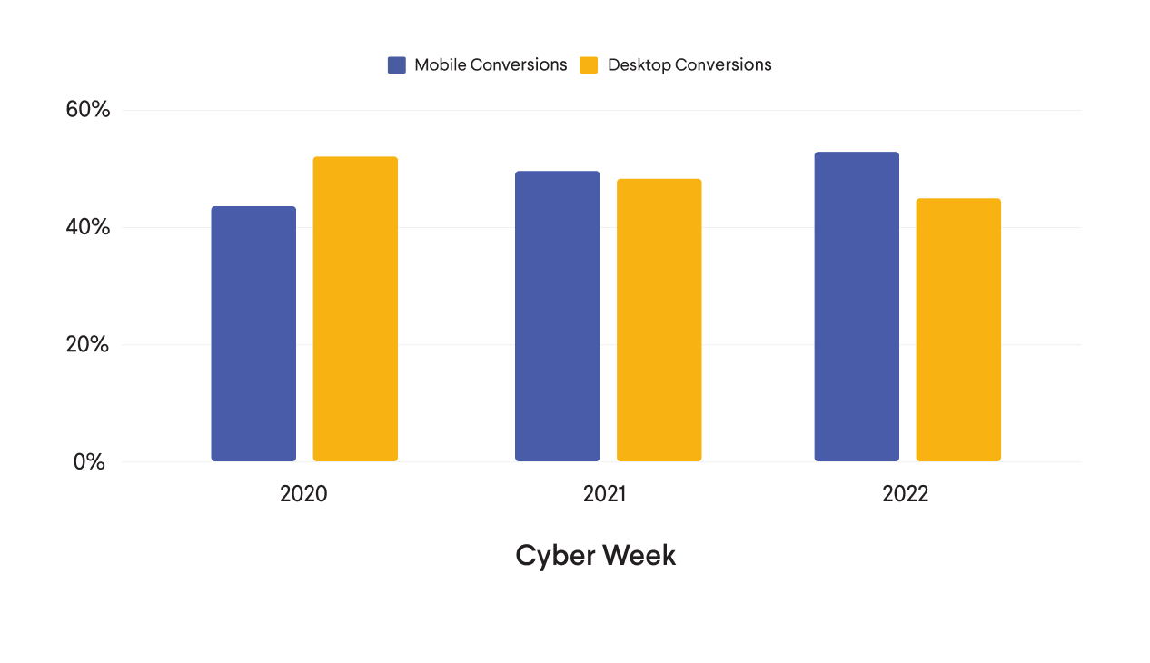 Don’t miss out on the mobile commerce revolution. In 2021, mobile conversions surpassed desktop conversions for the first time. In 2022, mobile expanded its lead, accounting for 53% of conversions, 8% higher than desktop. We expect this upward trend to continue. The convenience and ease offered by mobile shopping makes it a powerful tool for both consumers and retailers.