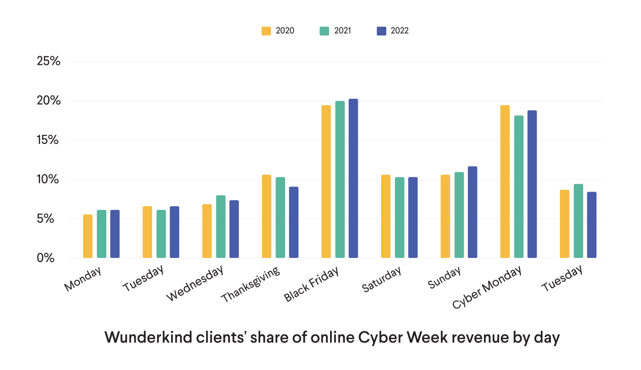 Cyber Week alone generates between 6-9% of annual revenue for Wunderkind brands, but Black Friday is the heavy hitter of the holiday season. This year, we expect its reigning streak to continue when it comes to revenue. While Cyber Monday stands strong in terms of sales, our data suggests that Black Friday will hold its position as the undisputed MVP of spending in 2023.