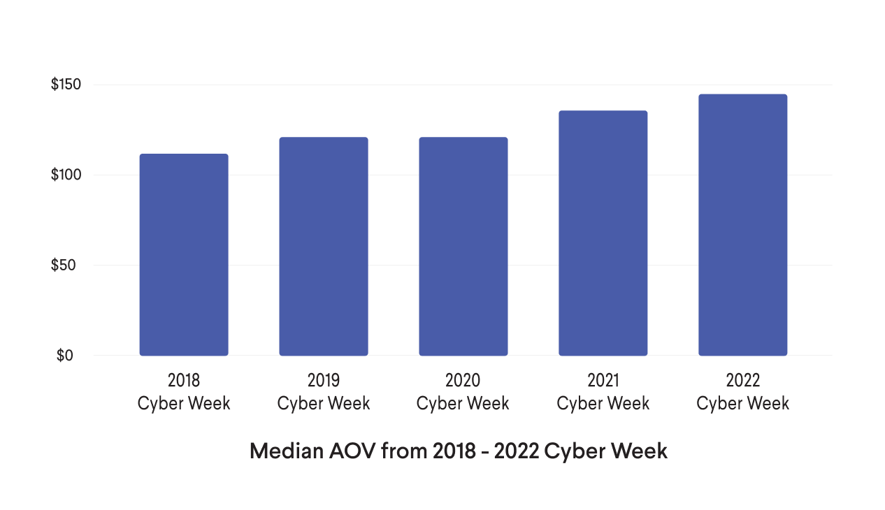 According to our data, the median AOV during Cyber Week increased by 26% from 2018 to 2022, reaching $144 million. We expect this positive trend to continue this year, meaning retailers should strategically recommend products to increase the size and price of shoppers’ carts.