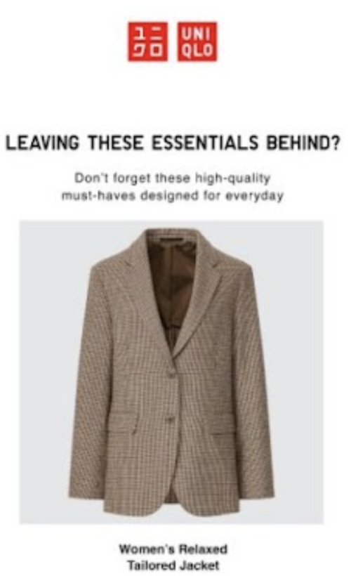 For example, UNIQLO reminded customers of the quality of the items left in their basket, such as this tailored jacket. By posing a question and using short, concise copy that reminds the shopper the jacket is designed for everyday wear and comfort, the shopper is prompted to reconsider their purchase.