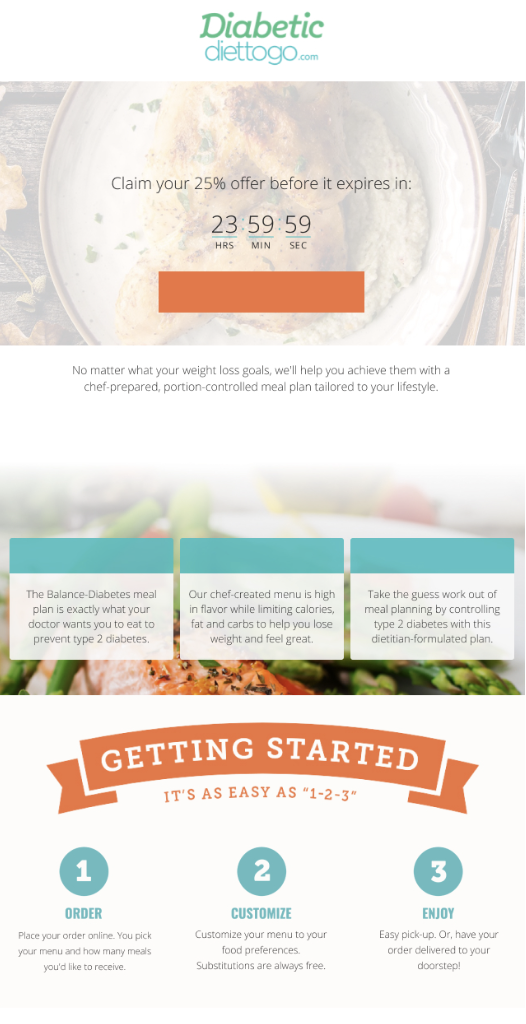 For example, Diet-to-Go sent follow-up emails to customers who hadn’t completed their diabetic meal plan sign-up, informing them of the health benefits of their plan. Product-specific information was included, alongside a 25% discount (on a timer). This abandoned cart email was not only personalized, giving the customer more information about what they were signing up for, but also created a sense of urgency to get started.