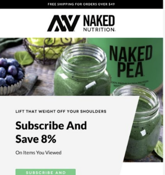 Here, Naked Nutrition offered the customer a subscribe and save discount based on items they’d previously viewed. Not only does this save the customer money and encourage conversion, but the subscription option enables future retargeting and may bring a stronger customer LTV.