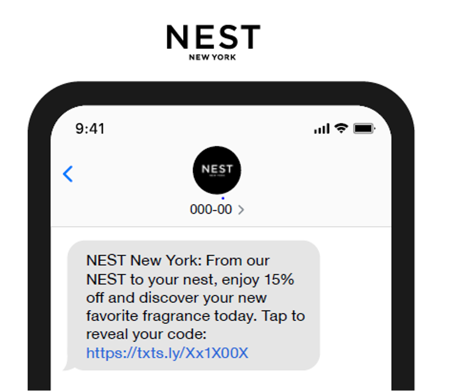 Here is a great text message marketing example from the luxury fragrance brand Nest New York. The brand thanks new subscribers with an exclusive offer and engages mobile subscribers with an invitation to become part of their “Nest.”