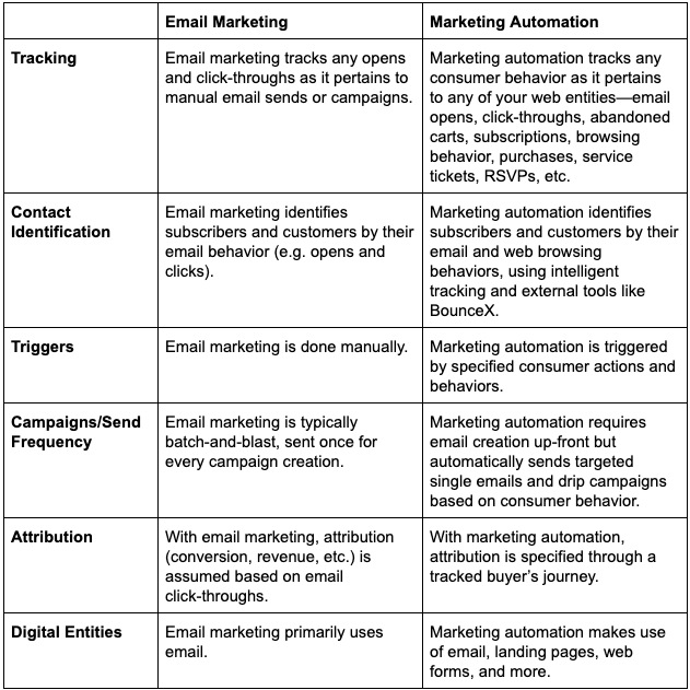 Email marketing and marketing automation differ in six distinct ways.