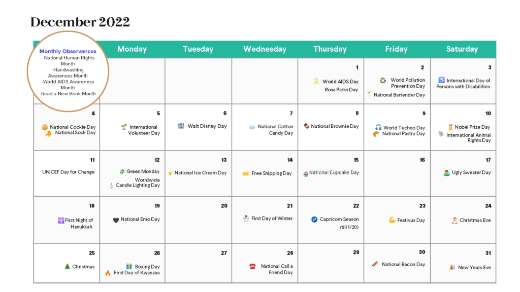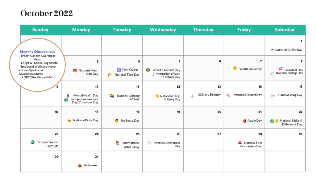 - Other favorites include National Coffee Day, Mean Girl day, or World Smile Day: