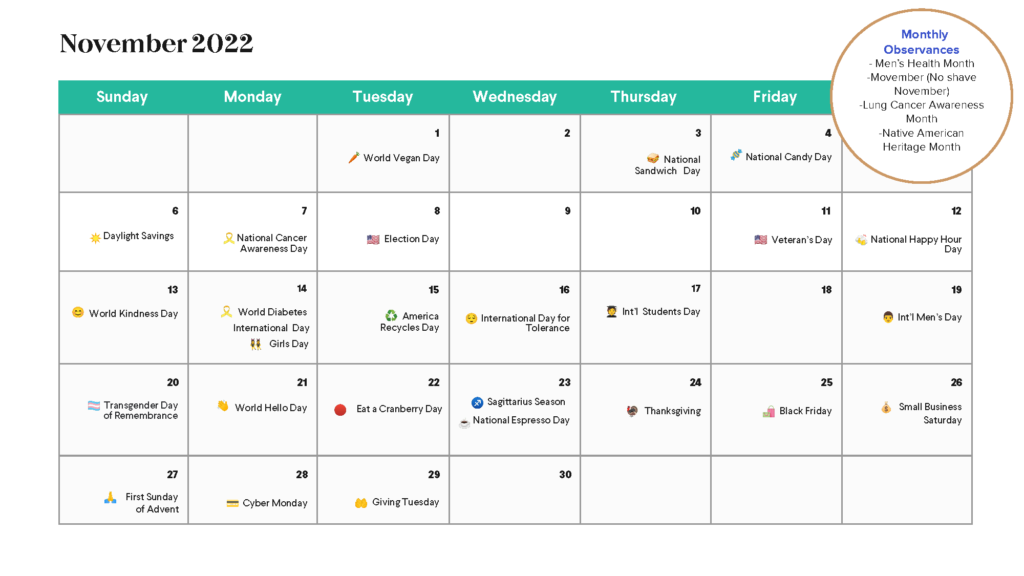 - Giving Tuesday – November 29th is Giving Tuesday. If your brand has a partnership with a non-profit, this is a great opportunity to promote that partnership and tell your customers if some of their spending with your brand is going to a good cause.