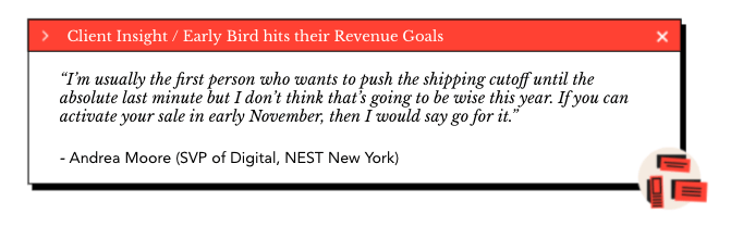 Additionally, with many first-time buyers being introduced to your brand during the holidays, it’s critically important to ensure that you can get your goods at the doorsteps of these households. Even more critically, they need to arrive in time for their individual days of celebration to avoid souring potential affinity to your brand. Moore’s advice for retailers looking to minimize this risk during Cyber Season is to reconsider when you end the shipping cutoff: “I’m usually the first person who wants to push the shipping cutoff until the absolute last minute but I don’t think that’s going to be wise this year. If you can activate your sale in early November, then I would say go for it.”