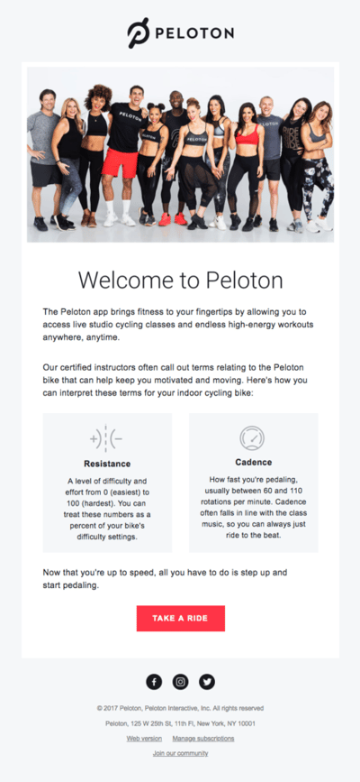 Peloton does something similar, closing their welcome email with an invitation to take their first ride on their brand new bike: