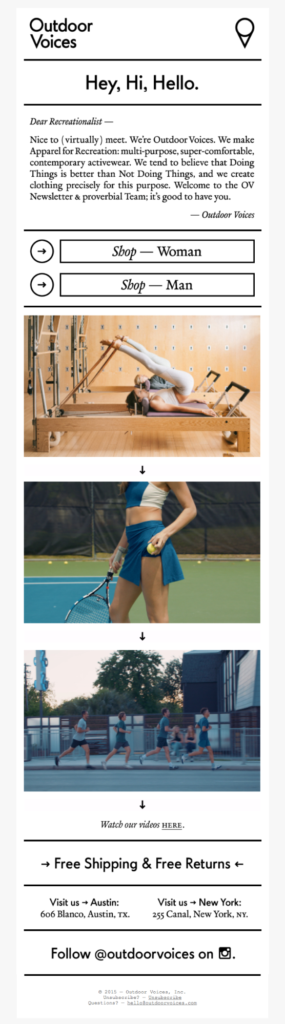 And it’s ok to not include a discount in your welcome email—this one from Outdoor Voices does a great job of saying hello: