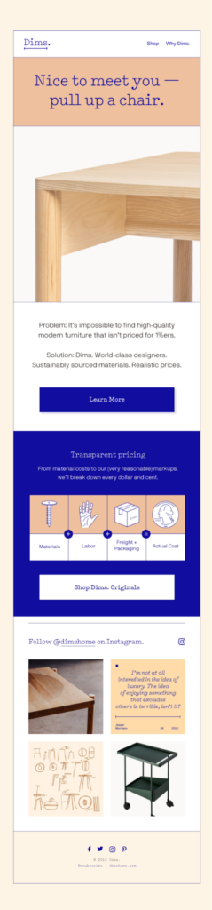 This welcome email from furniture company Dims offers a clear problem/solution framework so you know exactly what their brand is about. It’s no-nonsense, which seems to be perfectly on-brand.