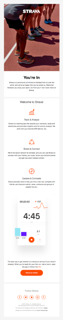 A welcome email may be the first time you’re talking to a subscriber, but it’s also the best time to drive momentum forward in your relationship. Can you get them to take another step forward? Strava asks their new subscribers to get going and record a recent activity, pushing them back into their app: