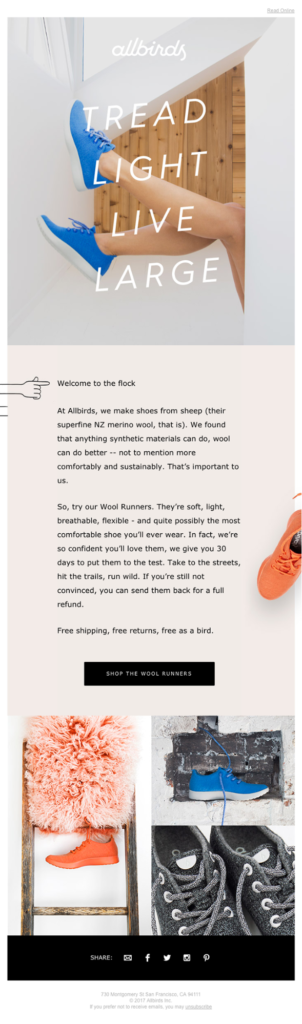 Most of all, your subject line should make it clear what they’ve joined, whether it’s a specific series, like an email-based course, or your general email list. This email from Allbirds, the shoe company, says, “Welcome to the Flock!” With Allbirds, you’re not just buying a shoe. You’re becoming part of a “flock” of people—and they make that really clear from the very first email.